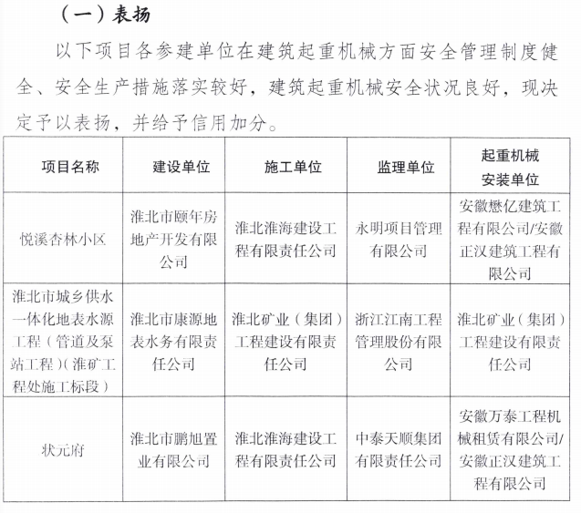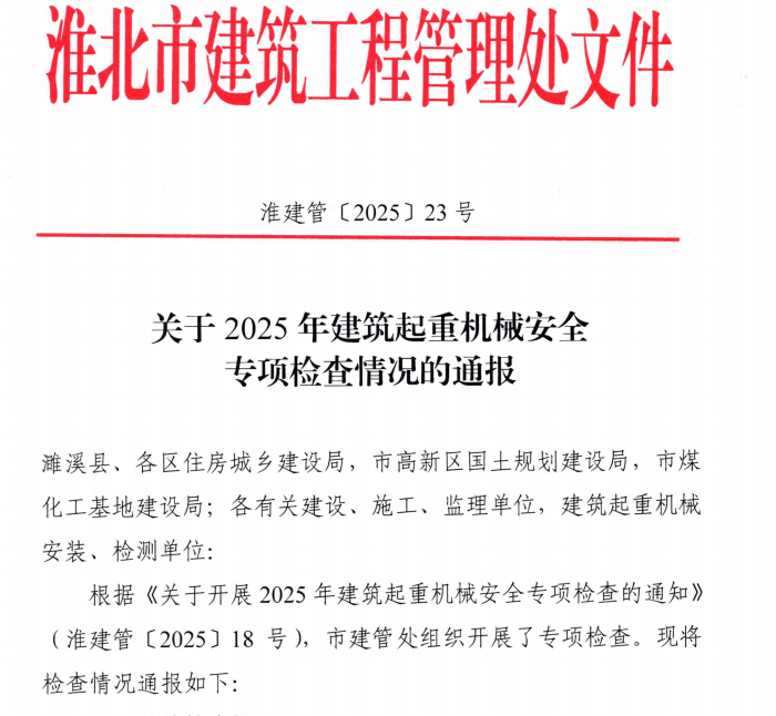 2025年7月21日,淮北市建筑工程管理處發(fā)布了2025年建筑起重機械安全專(zhuān)項檢查情況通報,淮海建工公司承建的悅溪杏林小區、狀元府兩個(gè)項目在安全管理制度健全、安全生產(chǎn)措施落實(shí)及建筑起重機械安全狀況良好等方面表現突出,獲得市建管處通報表?yè)P的同時(shí)也為公司贏(yíng)得了信用加分!